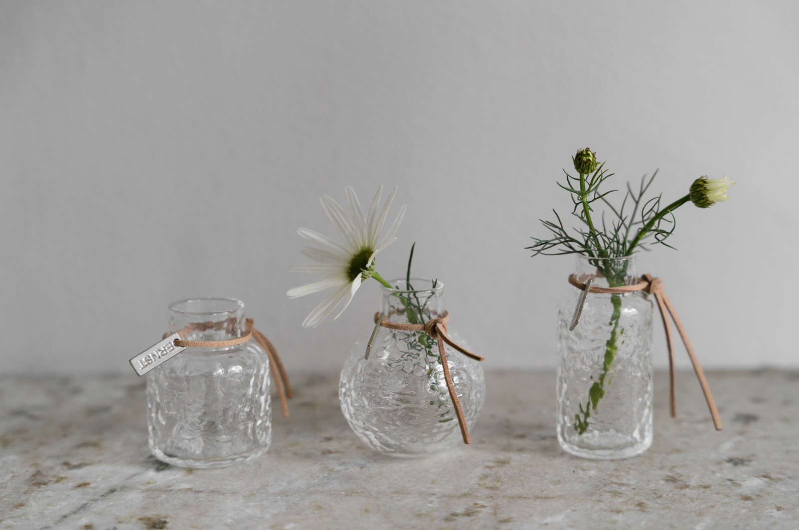 LANSERING 19/1 2026 Tre små ERNST vaser med struktur i en presentförpackning – en gåva till den som uppskattar det lilla extra. Perfekt för att låta ett par enkla blomster stå i centrum, som sticklingsvas eller som en vacker detalj på egen hand.