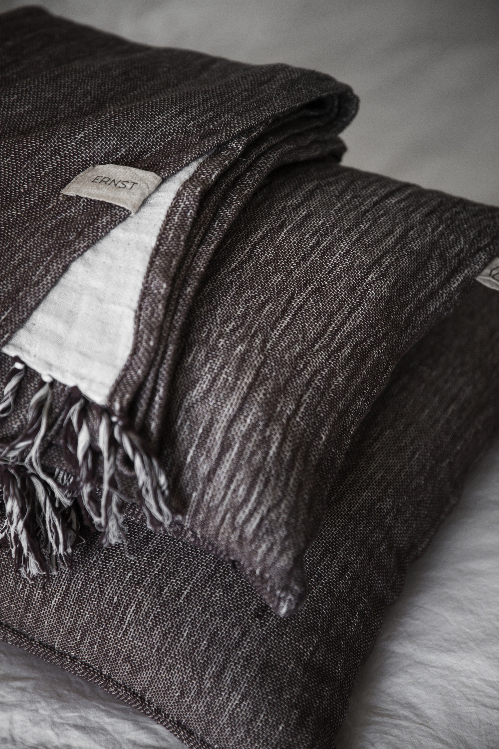 ERNST mysiga och mjuka pläd i en bomulls- och linneblandning är av härlig kvalitet och värmer både kropp och själ. Den är fin att dekorera hemmet med sina tvåfärgade sidor samt råa fransar.
