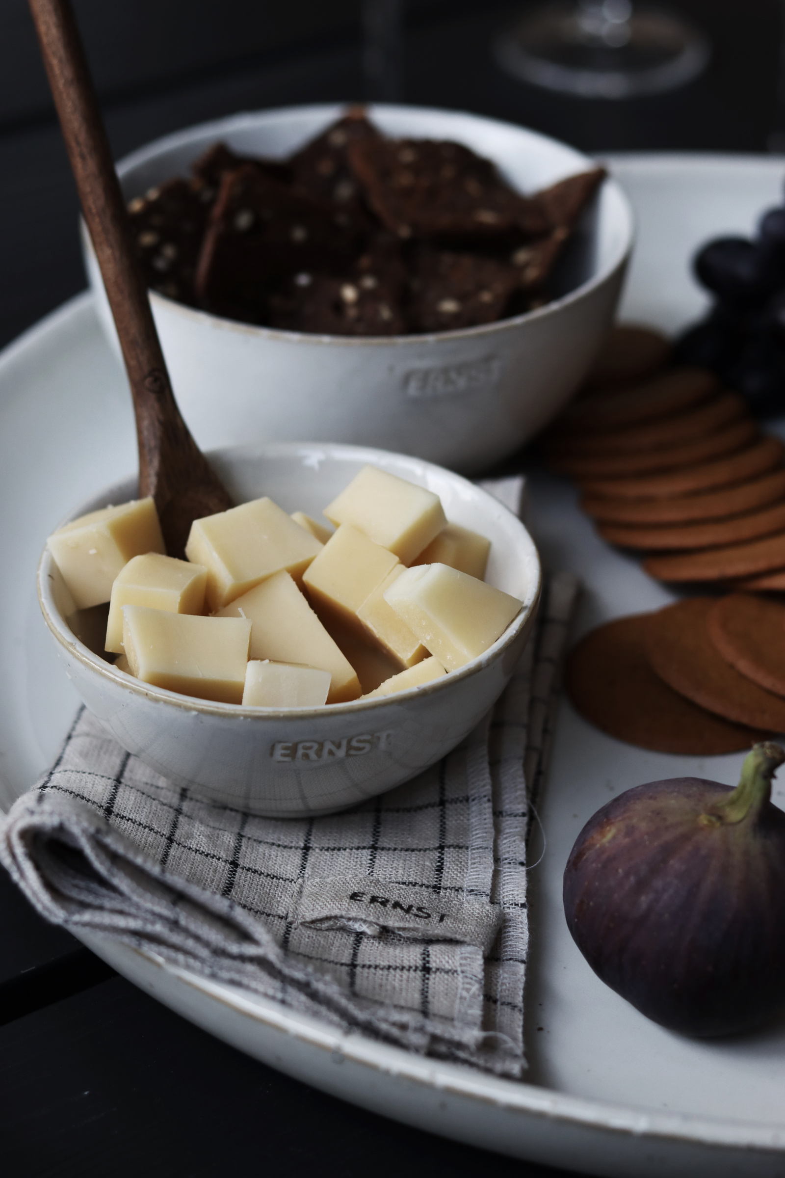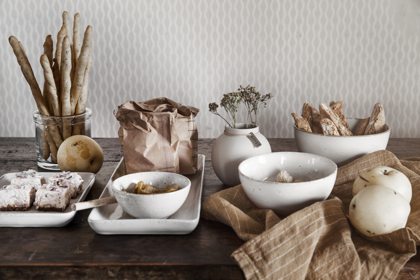 ERNST skål i glaserad stengods är en dekorativ serveringsskål som finns i fyra storlekar. I serien ingår även uppläggningnsfat.