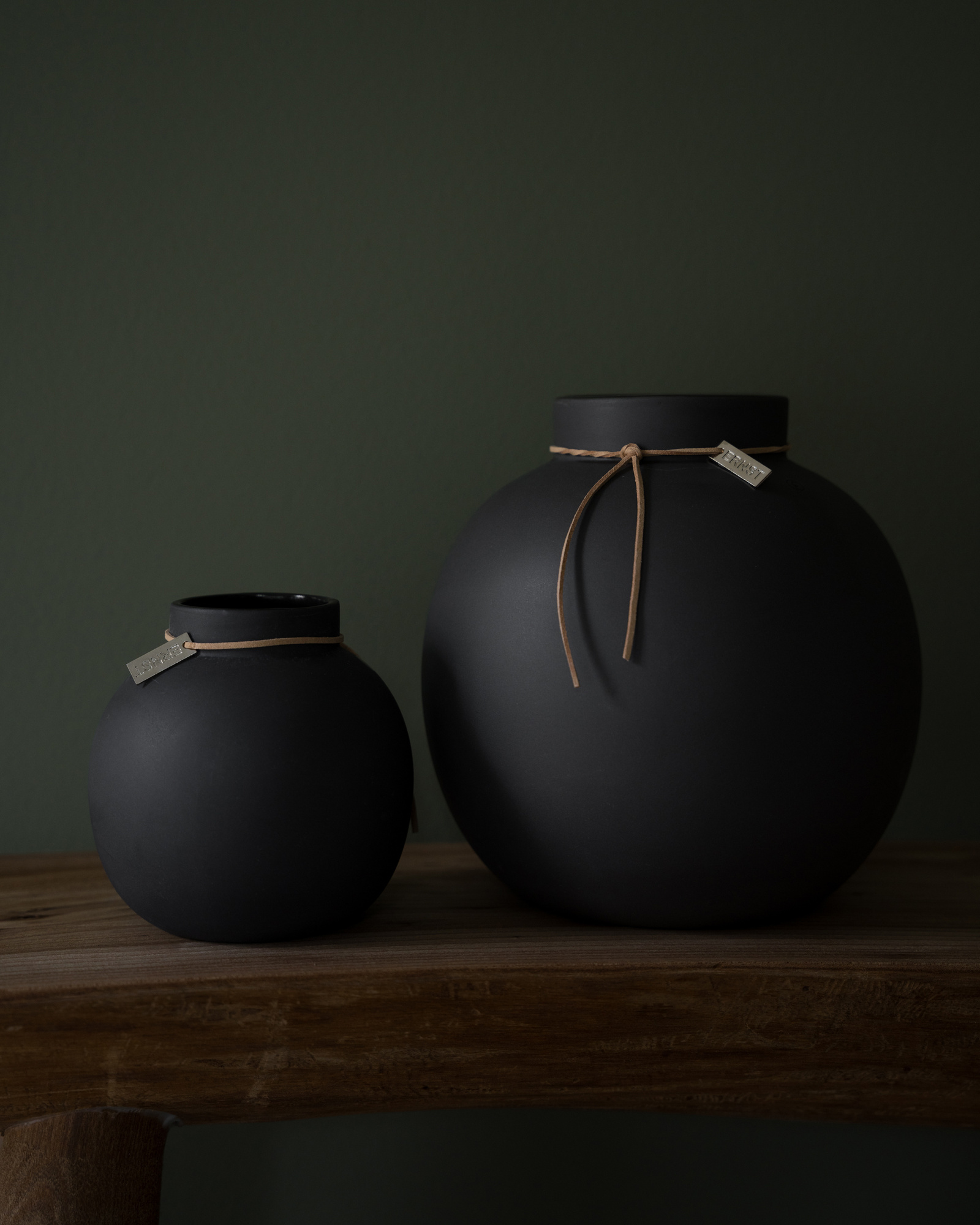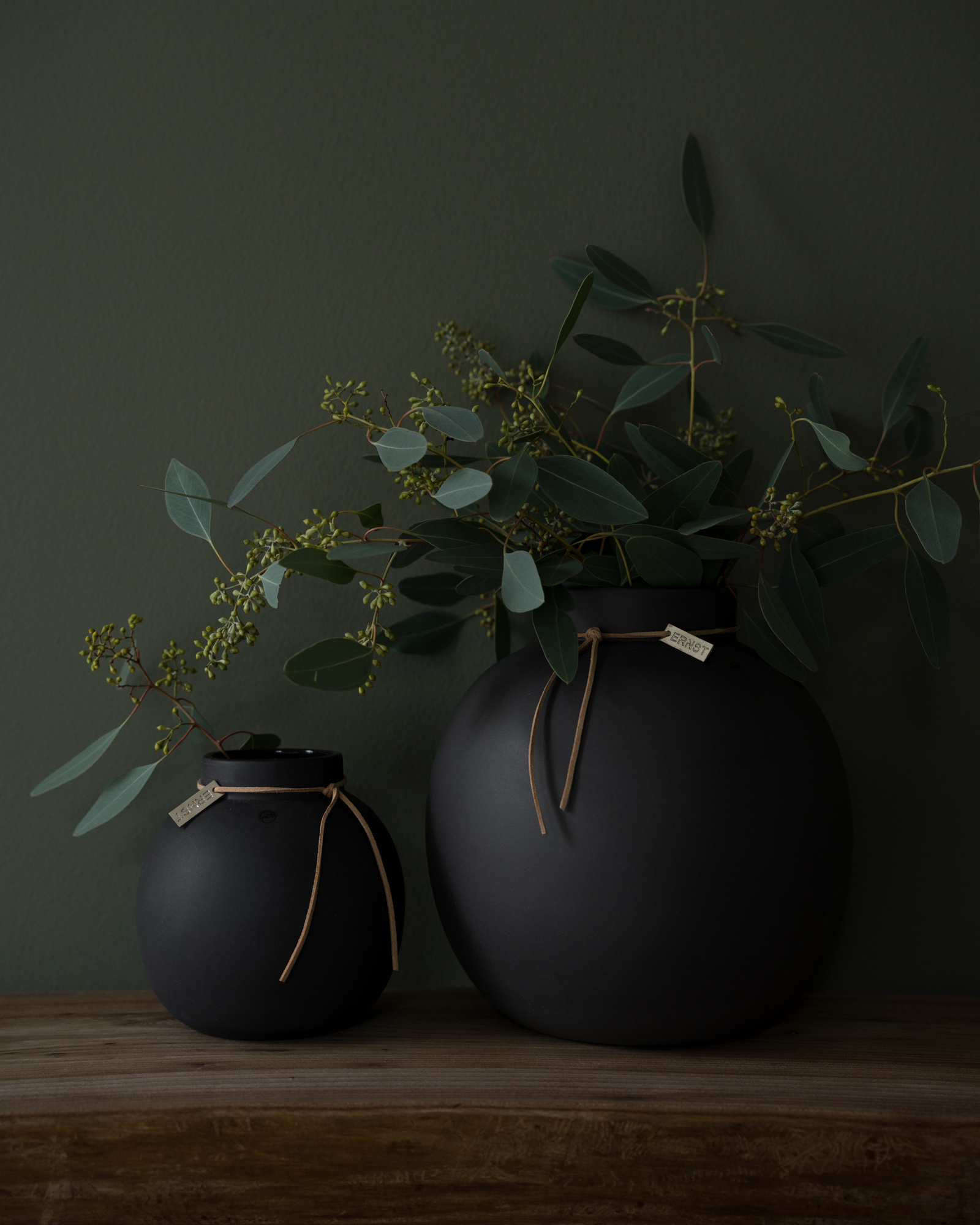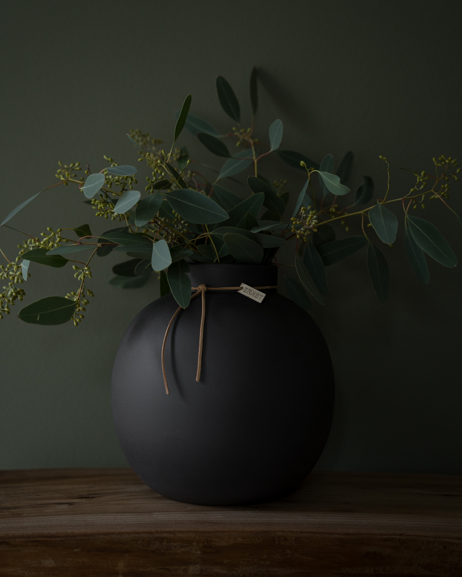 Snittblommor skapar liv och glädje i varje hem. I ERNST runda vas i stengods med läderband kan du skapa vackra blomsterarrangemang. Vasen finns i fyra olika färger, mörkgrå, natur, vit och rost.